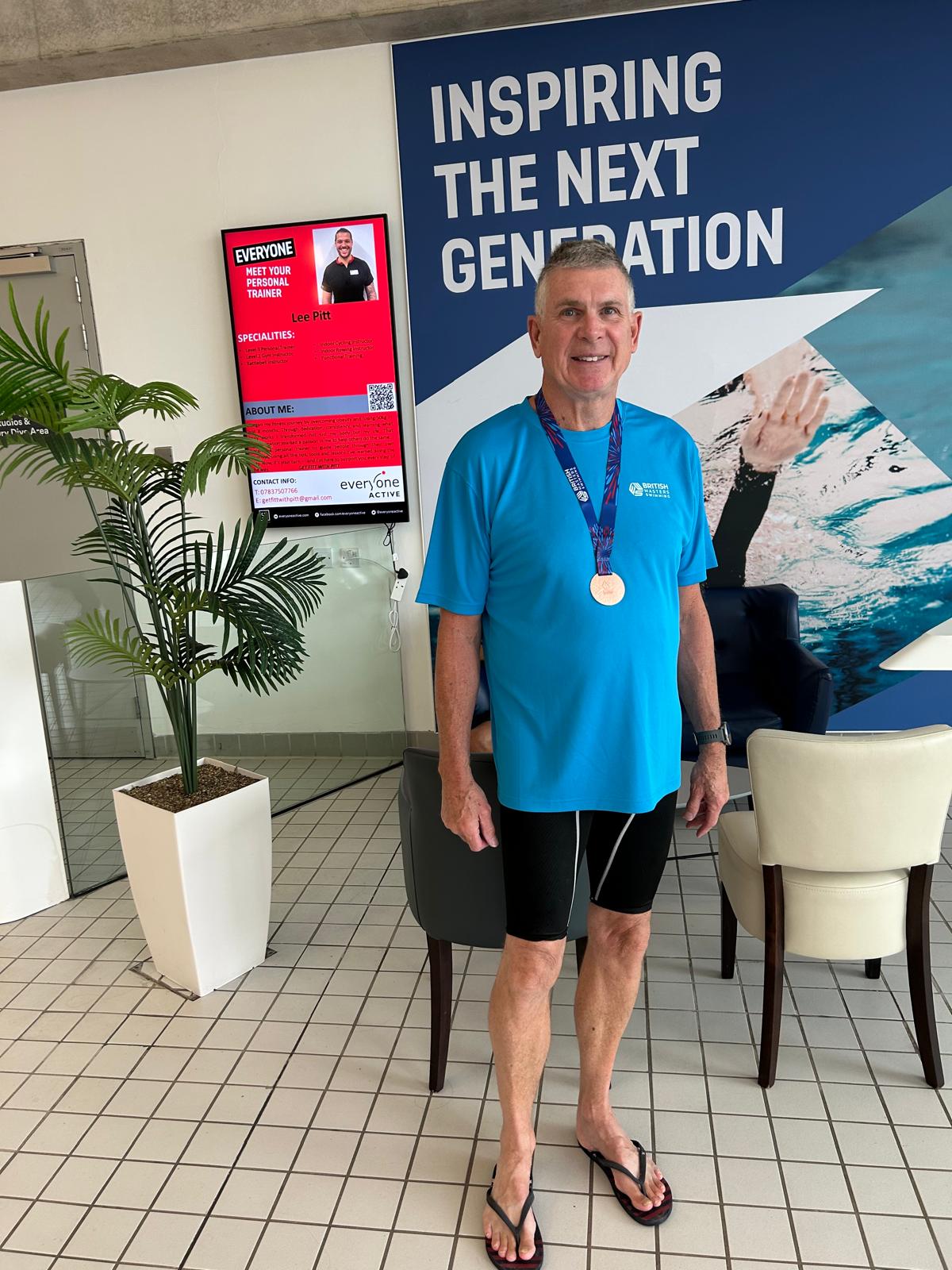 Most recently, I won a bronze medal in the 50m backstroke at the Swim England Championships last October, and another bronze in the same event in the GB Masters Championships in June at the London Olympic pool – see photo.